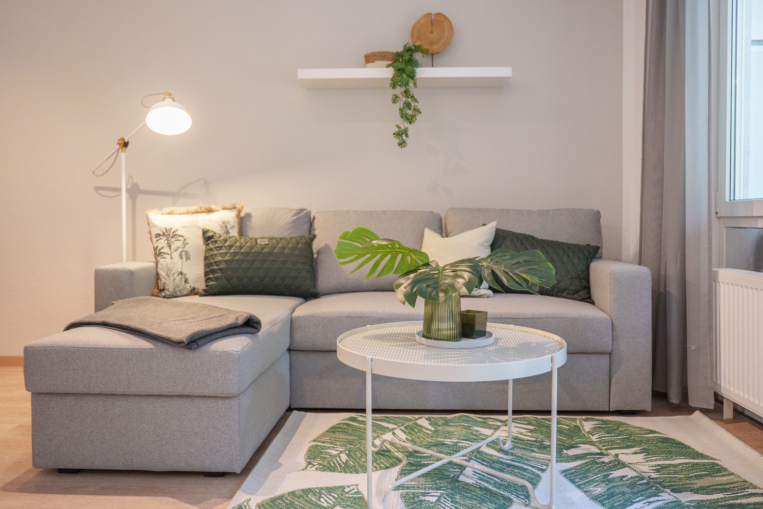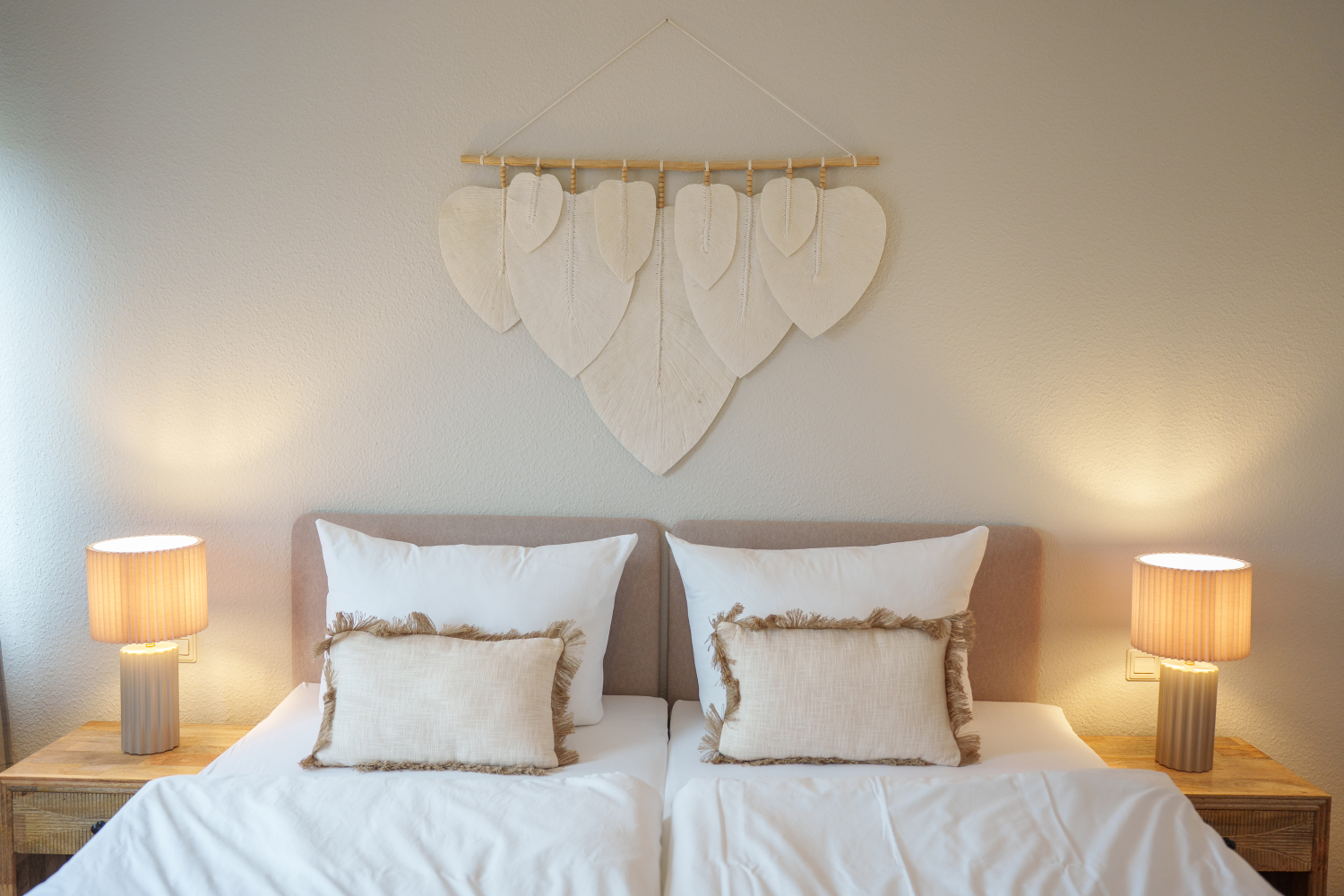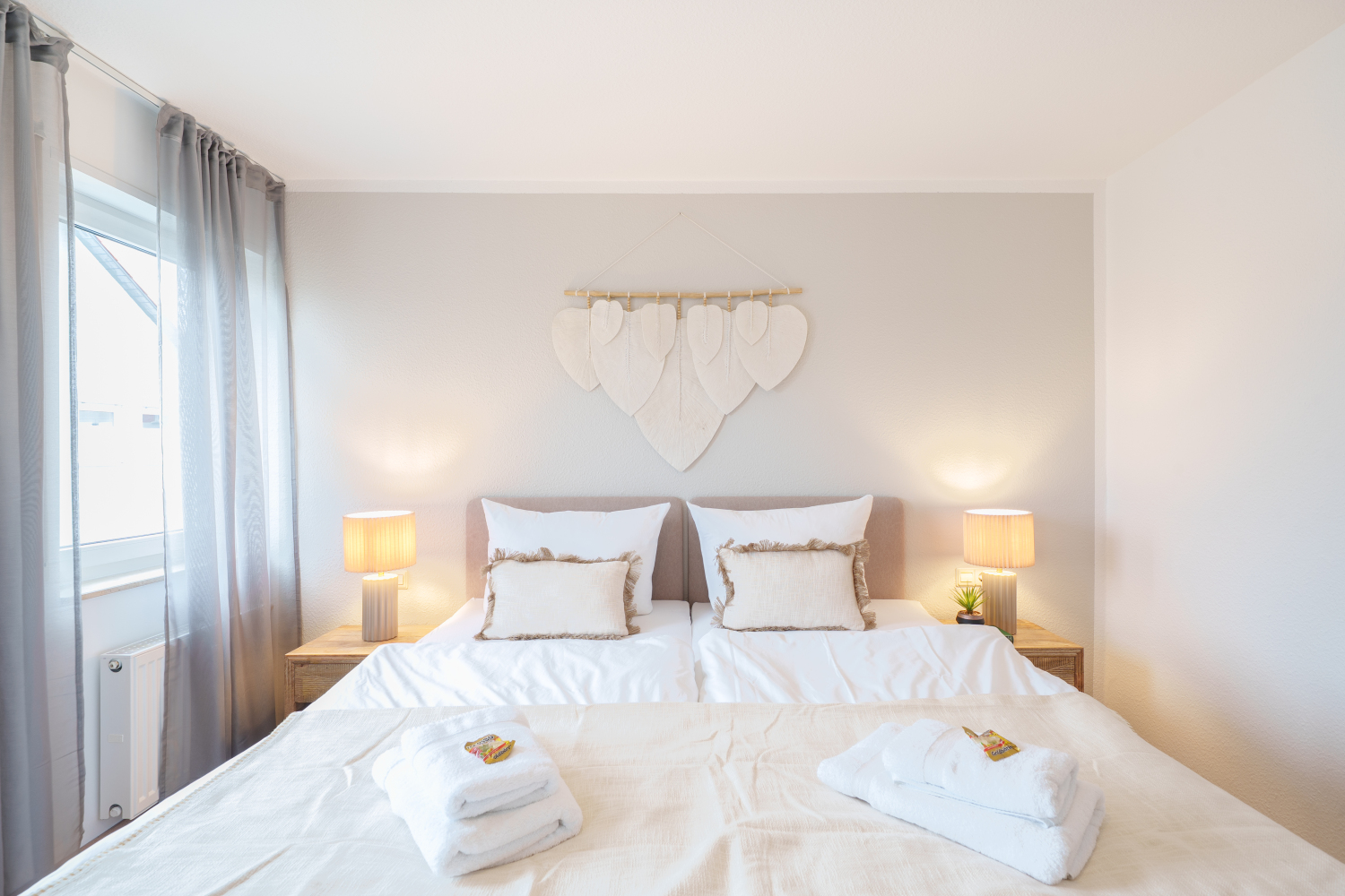 Mit zwei separaten Schlafzimmern und einer Schlafcouch im Wohnbereich bietet die Unterkunft bequem Platz für bis zu 6 Personen. Das große Wohnzimmer lädt mit Smart-TV und Highspeed-WLAN zu gemütlichen Filmabenden oder entspannten Lesestunden ein.